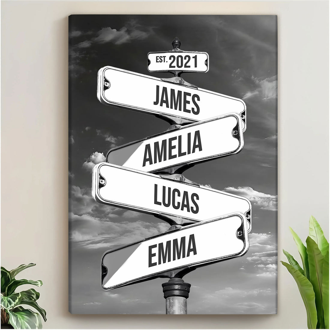 Personalized Family Crossroads Street Sign Canvas, Custom Multiple Name Date Wall Art Stormy Sky