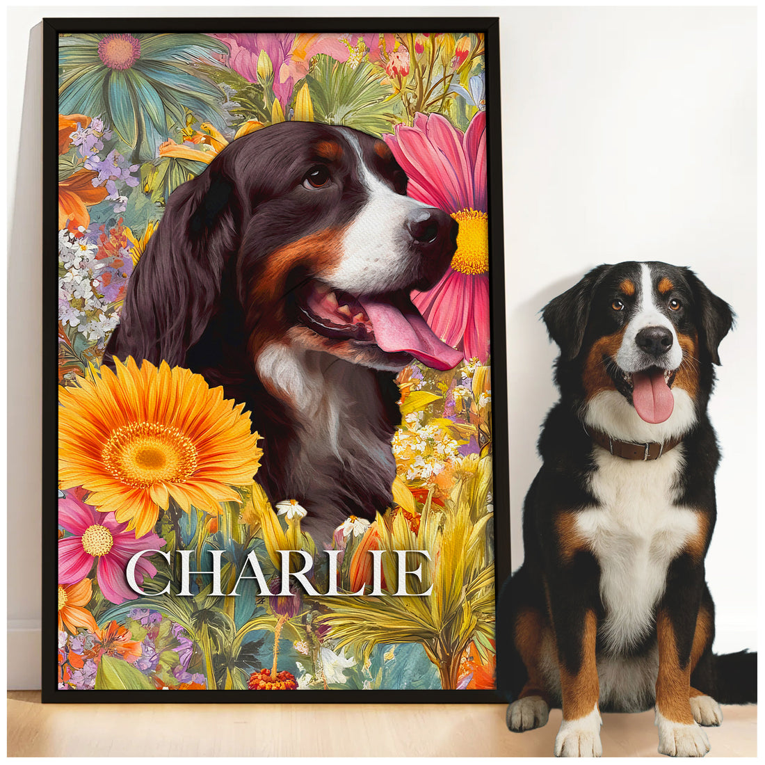 Personalized Floral Pet Portrait Canvas from Photo – Colorful Watercolor Dog Art for Home Decor