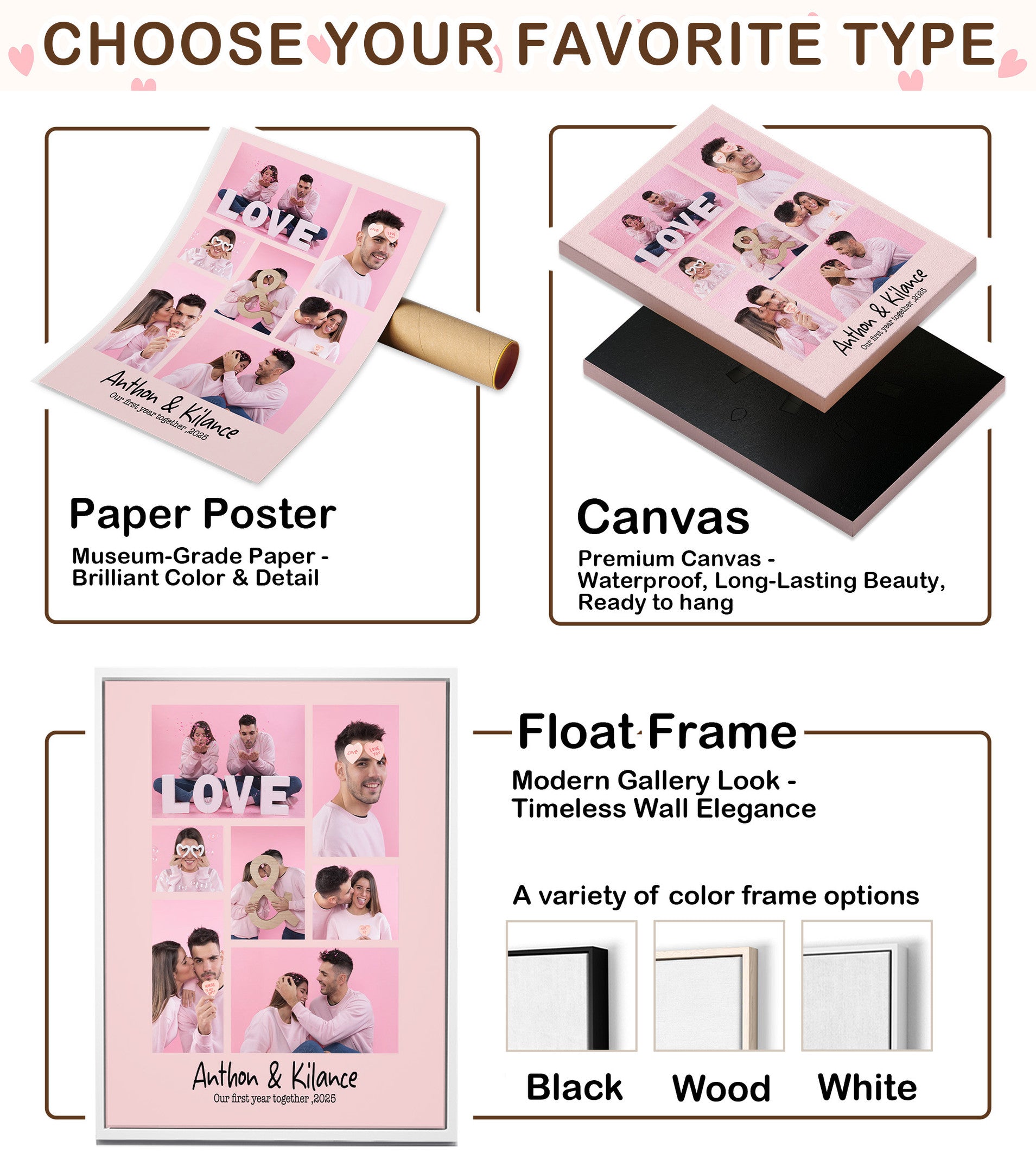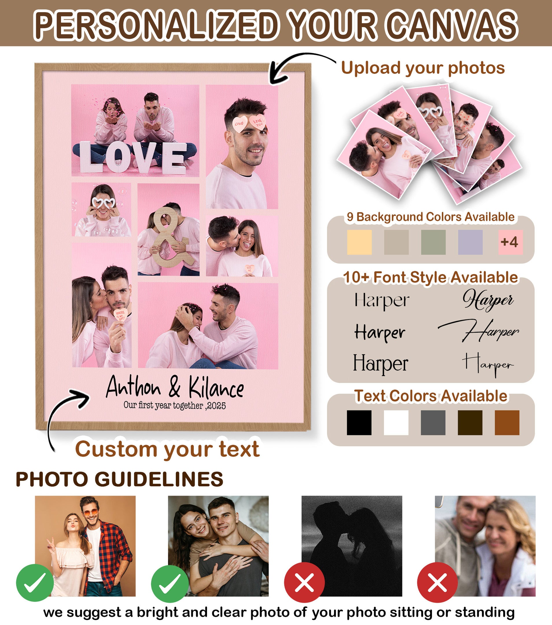 Create a custom collage canvas in minutes. Upload 7 photos, customize layout, text, and colors to tell your love story, family journey, or pet memories.