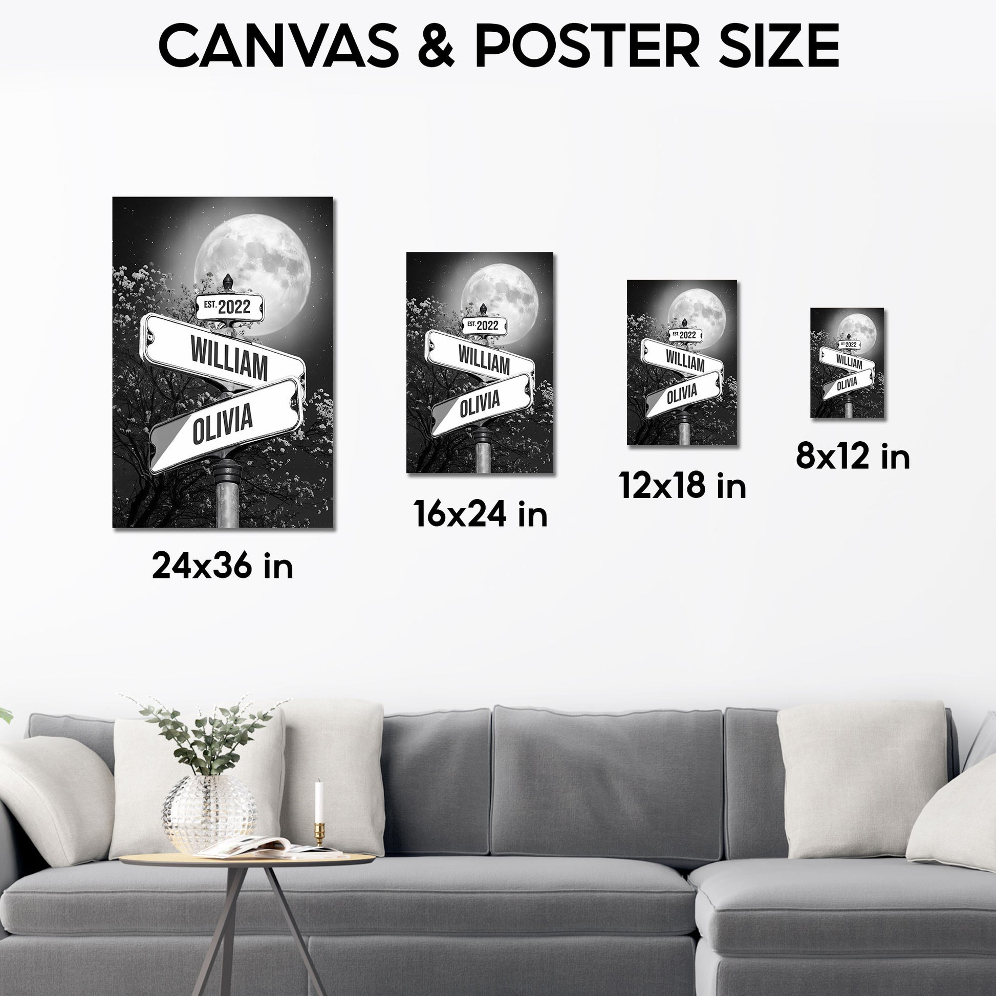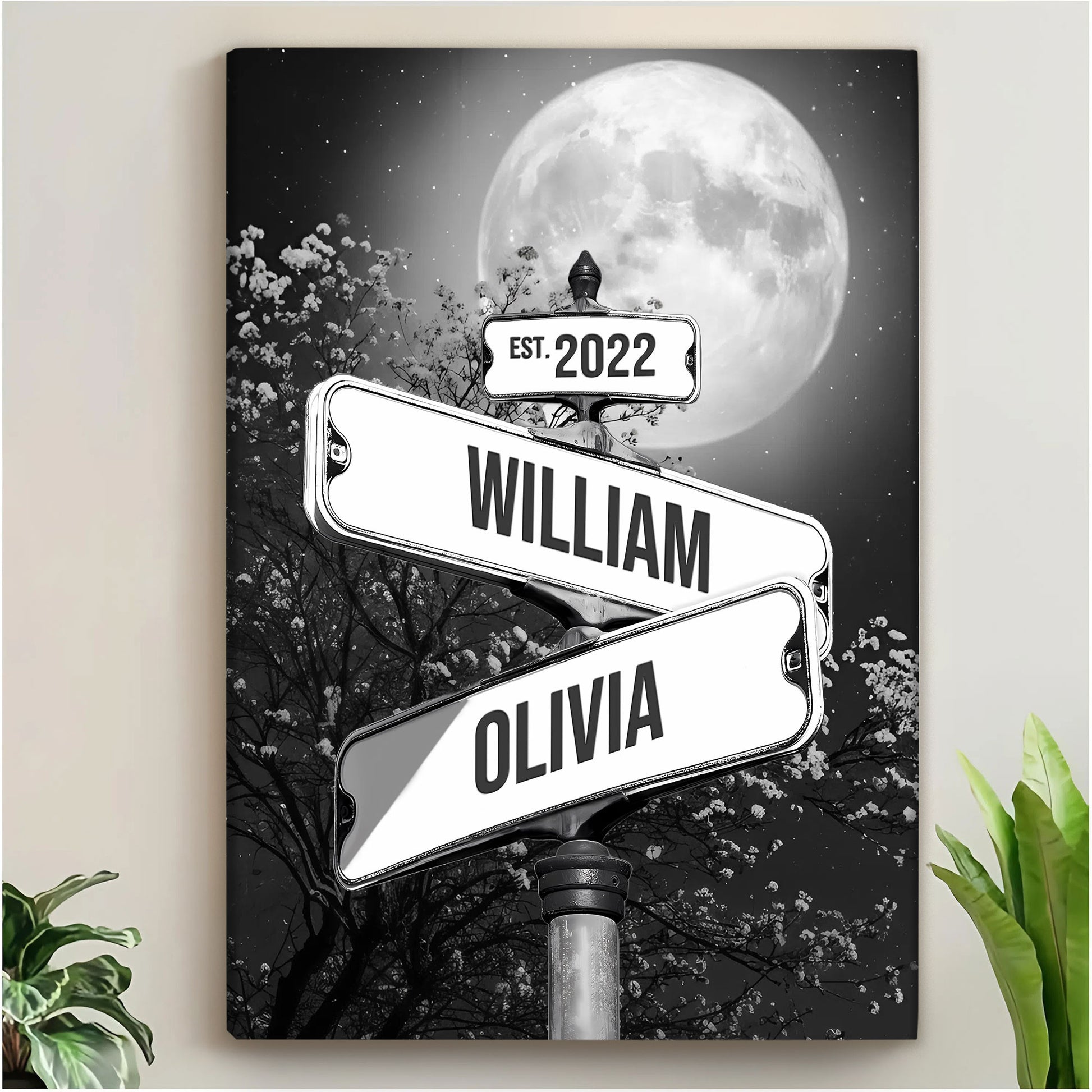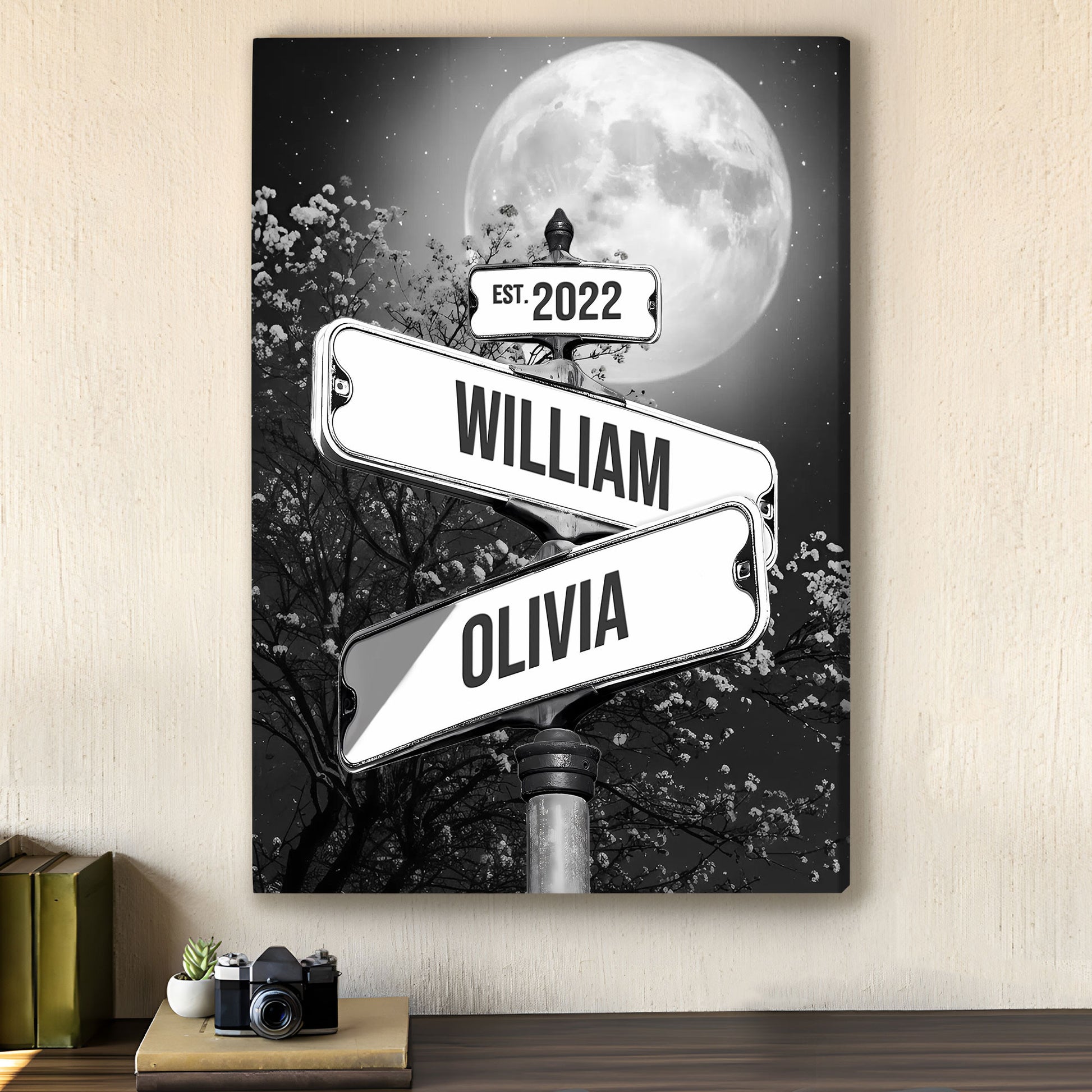 Personalized Crossroads Street Sign Canvas, Custom Couple Name Date Wall Art Full Moon Night
