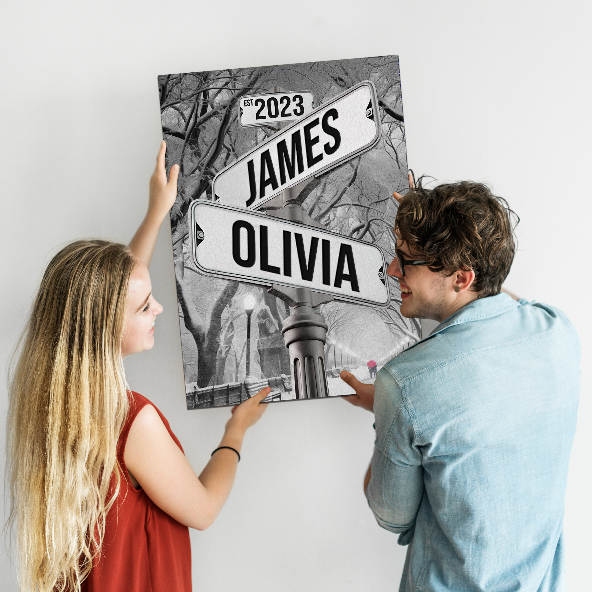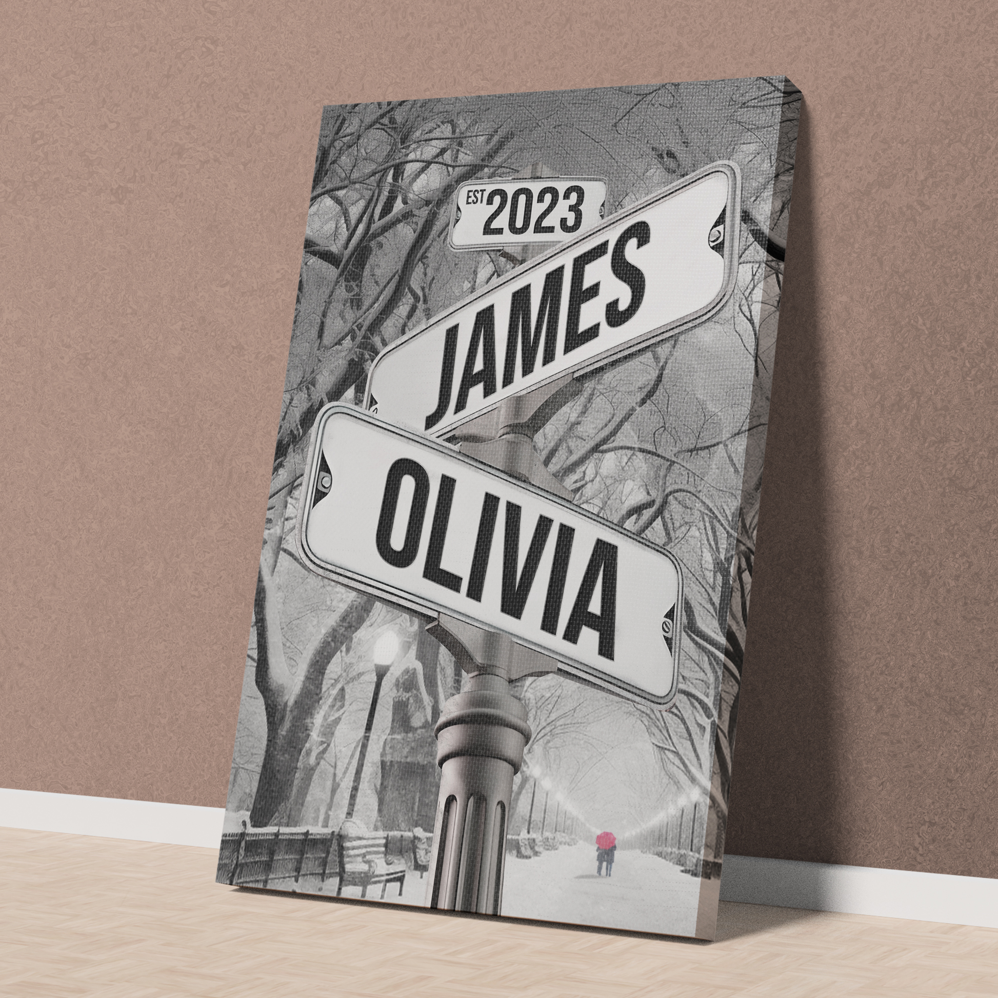 Personalized Crossroads Street Sign For Couples Canvas, Custom Couple Name And Date Wall Art Winter Park Snow