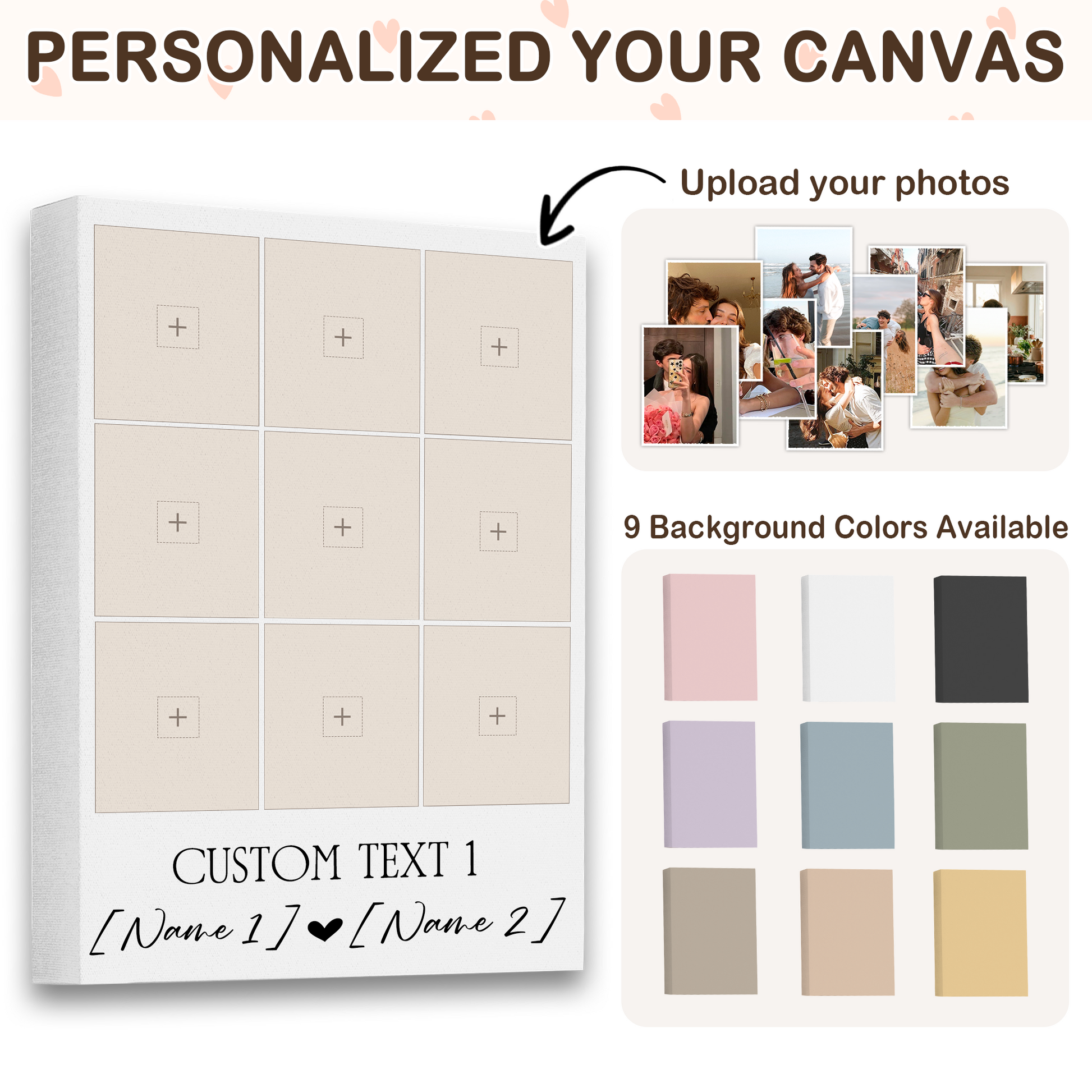 Create a custom collage canvas in minutes. Upload 9 photos, customize layout, text, and colors to tell your love story, family journey, or pet memories.