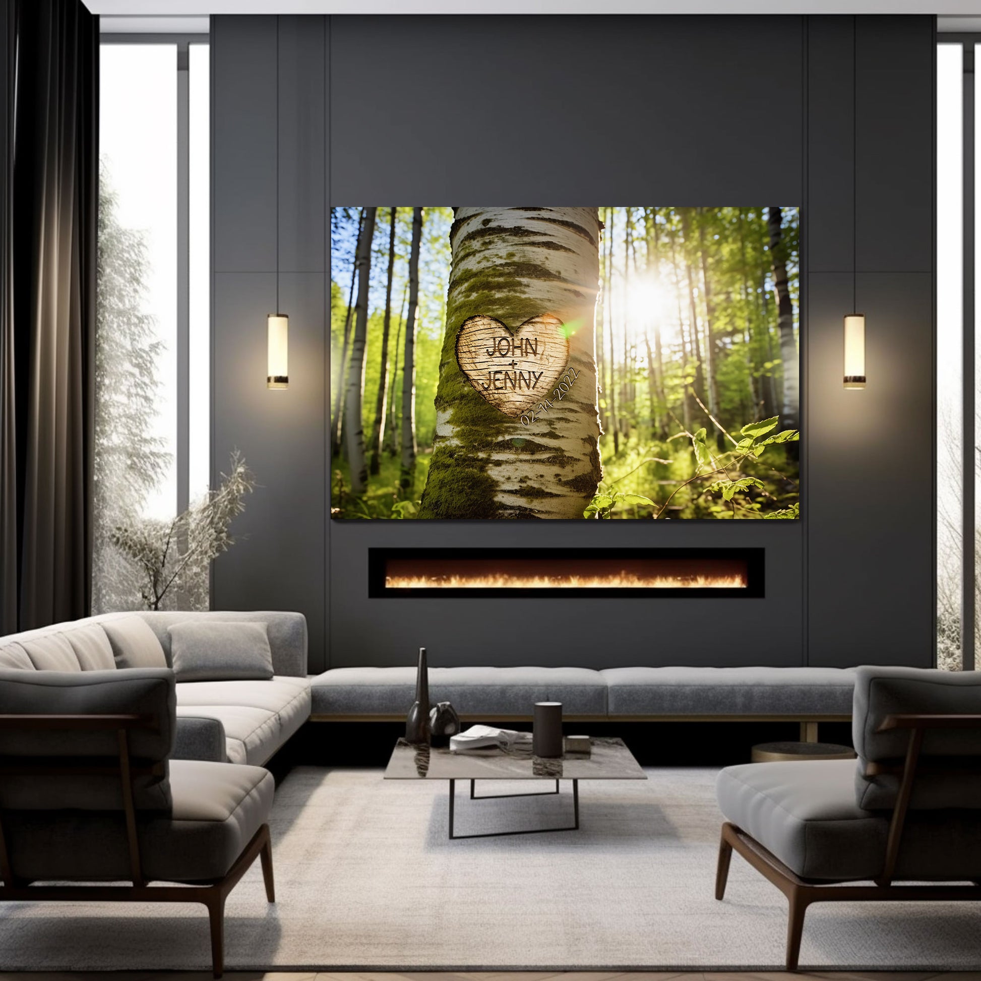 Personalized Rustic Birch Tree Canvas, Custom Names Date Wall Art for Couples