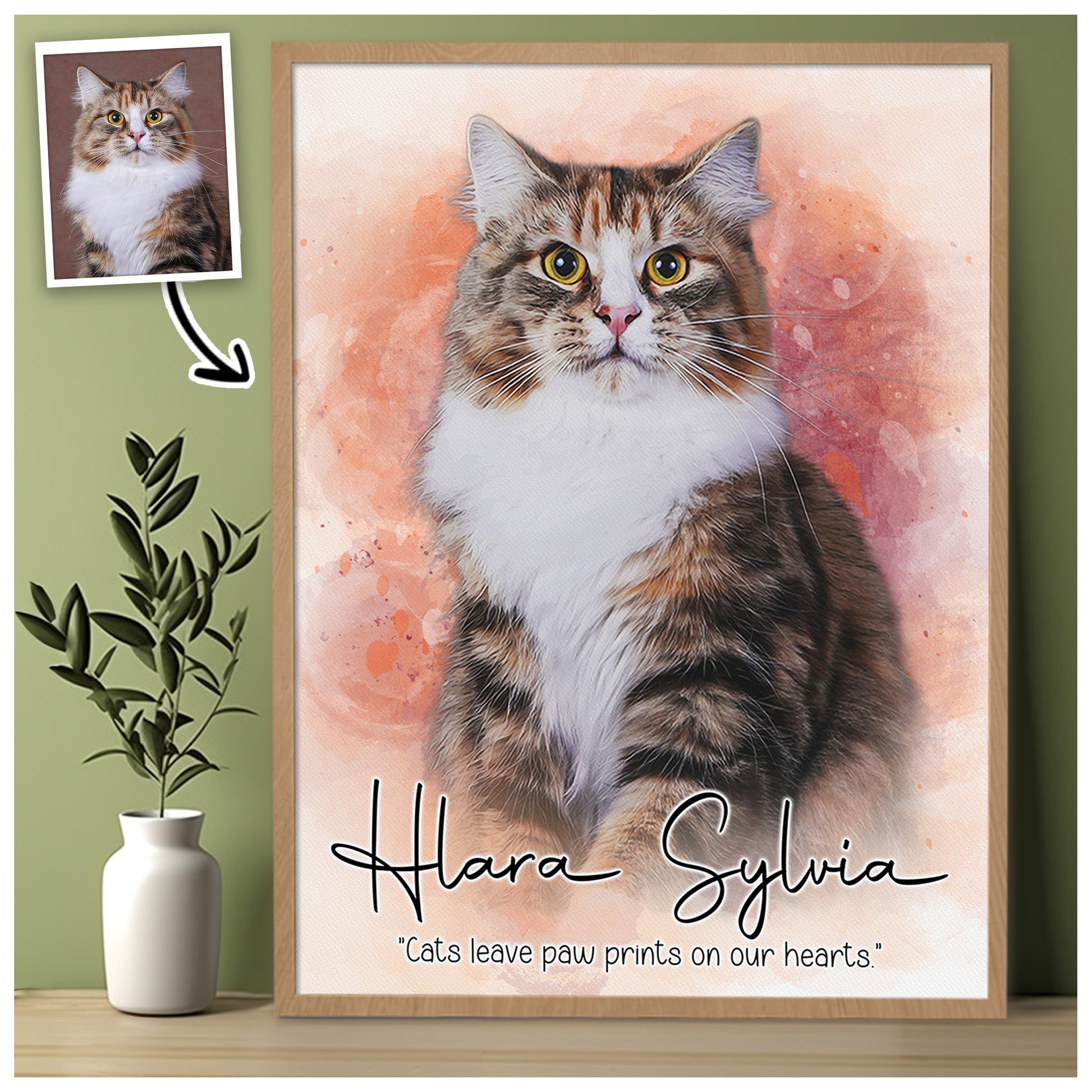 Personalized Watercolor Cat Portrait Canvas from Photo – Custom Wall Art Gift For Cat Lovers
